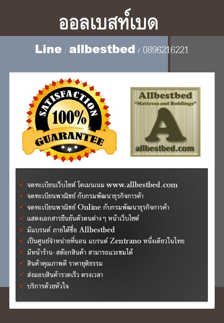 ศูนย์รวมเครื่องนอนโรงแรม มาตรฐาน ครบวงจร จำหน่าย (ปลีก-ส่ง) ที่นอนแบรนด์ "เซนทราโน่" ฐานรองที่นอน หัวเตียง และรับผลิต จำหน่าย (ปลีก-ส่ง) ผลิตภัณฑ์ประเภทผ้า ผ้าโรงแรมไทย สำหรับธุรกิจโรงแรม รีสอร์ท ที่พัก สปา ฯลฯ ทั้งชุดเครื่องนอน ผ้าปูที่นอน (รัดมุมและไม่รัดมุม) ปลอกผ้านวม ไส้ผ้านวม ไส้หมอน ผ้ารองกันเปื้อน ผ้าขนหนูไทย สีขาว ขนคู่ เสื้อคลุมอาบน้ำ รองเท้าสลิปเปอร์ คุณภาพดี เราคัดสรรสิ่งที่ดีที่สุดเรื่องเครื่องนอนสำหรับคุณ สินค้าทุกชิ้นผลิตจากวัตถุดิบและเส้นใยมาตรฐานสูง คุณภาพเกินราคา คุ้มค่ากับการลงทุน เริ่มดำเนินธุรกิจตั้งแต่ เดือน ธันวาคม 2552 (ค.ศ.2009) เริ่มดำเนินธุรกิจผ่านสื่อออนไลน์ครั้งแรก เดือน กรกฎาคม พ.ศ. 2553 (ค.ศ.2010) และดำเนินธุรกิจผ่านสื่อออนไลน์ เต็มรูปแบบ www.allbestbed.com เมื่อเดือน กุมภาพันธ์ 2556 (ค.ศ.2013) จดทะเบียนพาณิชย์ออนไลน์ เมื่อเดือน กันยายน 2556 (ค.ศ.2013) โดยเป็นศูนย์จำหน่ายอย่างเป็นทางการหนึ่งเดียวในประเทศไทย ผลิตภัณฑ์ที่นอน แบรนด์ ZENTRANO เซนทราโน่ ที่นอนคุณภาพ ที่สุดแห่งเทคโนโลยีการนอนจาก "ประเทศอิตาลี" เหมาะสำหรับโรงแรม-ที่พัก โดยเฉพาะ และเป็นผู้รับผลิต-จัดจำหน่าย ผลิตภัณฑ์ชุดเครื่องนอน-หมอน-ผ้าขนหนู คุณภาพดี เกรด A สำหรับโรงแรม-ที่พัก-โรงพยาบาล-วัด (ผ้าปูที่นอน ปลอกหมอน ปลอกผ้านวม ไส้ผ้านวม ไส้หมอนหนุน ไส้หมอนข้าง ไส้หมอนอิง ผ้ารองที่นอนกันเปื้อน) มีสินค้าให้เลือกหลากหลายขนาด หลากหลายเนื้อผ้า ทั้งผ้า Cotton 100% Super Soft ทอ 200 เส้น (สีขาวล้วน) , Cotton 100% ทอ 220 (สีขาวล้วน) และ Cotton 100% ทอ 260 เส้น (ลายริ้วซาตินสีขาว) -- ผ้าขนหนู ทอแบบเส้นคู่ Cotton100% (ผ้าเช็ดหน้า ผ้าเช็ดตัว ผ้าเช็ดผม ผ้าเช็ดมือ ผ้าเช็ดเท้า ผ้าห่มสระน้ำ ผ้าห่มชายหาด ผ้าห่มขนหนู ผ้าห่มเสริม ผ้าห่มสำรอง ผ้าห่มโรงพยาบาล) มีสินค้าให้เลือกหลากหลายขนาด สินค้าสำหรับโรงแรม-ที่พัก ทุกรายการเป็นสินค้าเกรด A ถึง เกรดพรีเมี่ยม มั่นใจได้ในคุณภาพ เพราะเรามีโรงงานผลิตที่ได้มาตรฐานในการผลิตสินค้า วัตถุดิบหลักเป็นฝ้ายในประเทศไทย เครื่องจักรนำเข้าจากประเทศญี่ปุ่น เน้นการตัดเย็บที่ประณีต เรียบร้อย สวยงาม คงทน ทอขอบในตัว เอกลักษณ์เฉพาะจากออลเบสท์เบด และจำหน่ายในราคาที่ยุติธรรม ในปัจจุบันผลิตภัณฑ์จากออลเบสท์เบดได้รับการตอบรับที่ดีทั้งจากลูกค้าในเครือธุรกิจโรงแรม-ที่พัก-โรงพยาบาล รวมถึง วัด-สถานฑูต และลูกค้าปลีกที่ซื้อใช้เอง สำหรับลูกค้าส่งและลูกค้าโครงการเรามีบริการจัดสินค้าเข้าโครงการในราคาที่ท่านพึงพอใจ มีบริการจัดส่งสินค้าทั่วประเทศทุกรายการ ส่งมอบสินค้าตรงตามเวลา บริการจากใจอย่างเ